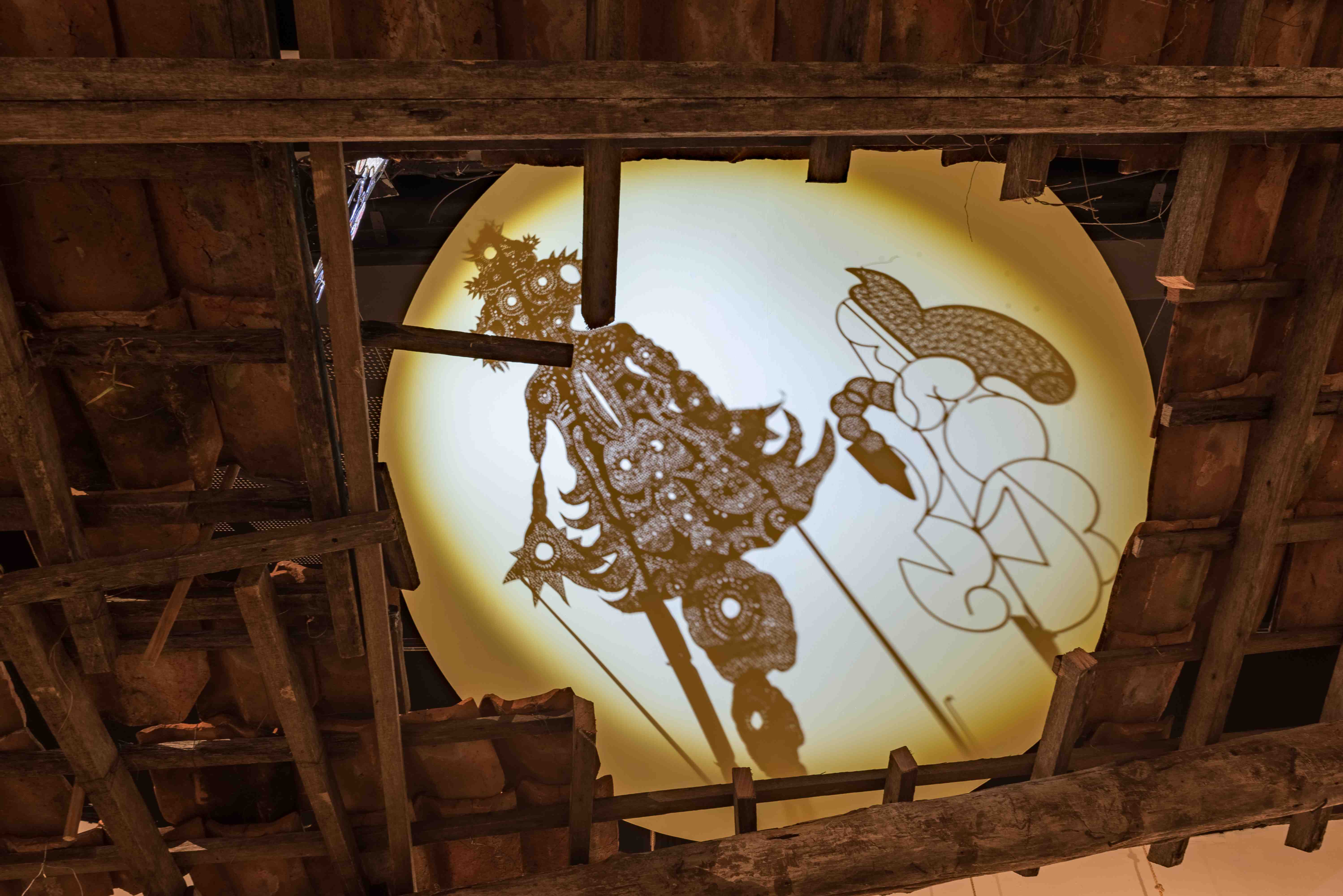 Dibayangi oleh layar berbentuk bulan yang menggantung di atasnya, rumah ini menjadi ruang pertemuan antara wayang karton Imam Sucahyo dan figur baja dan kulit Nindityo Adipurnomo yang masing-masing dengan ‘suara material’ yang berbeda, namun saling memantulkan retakan sosial, kerinduan bersama, dan daya hidup kolektif.